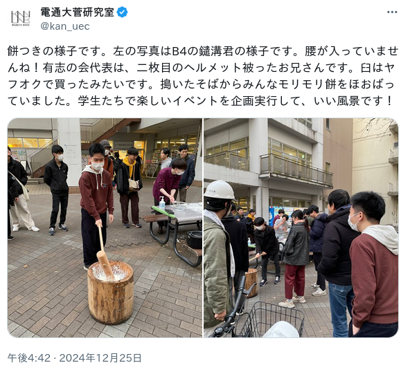 2024年12月25日クリスマス、なかがわ電機サービスと複数名の有志により、電気通信大学の学内で勝手に餅つきを開催しました。ここにその記録を残そうと思います。