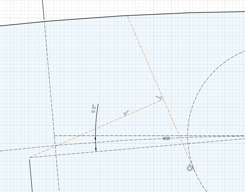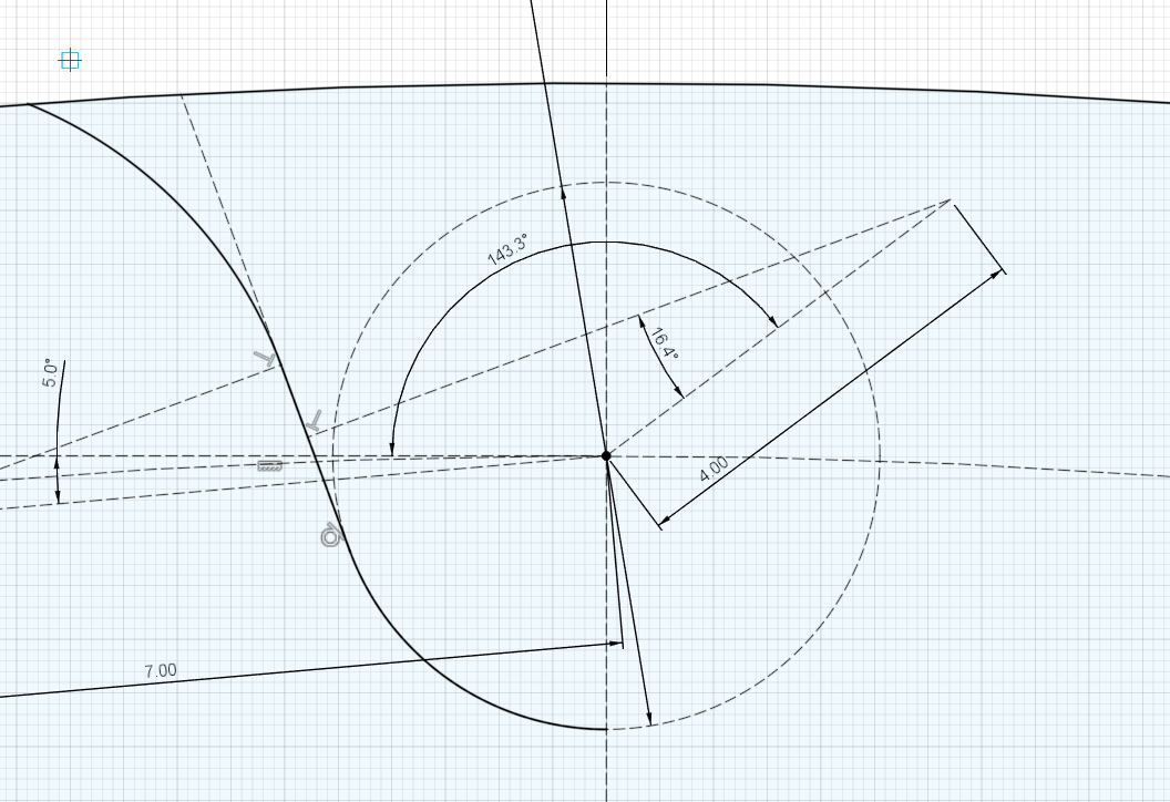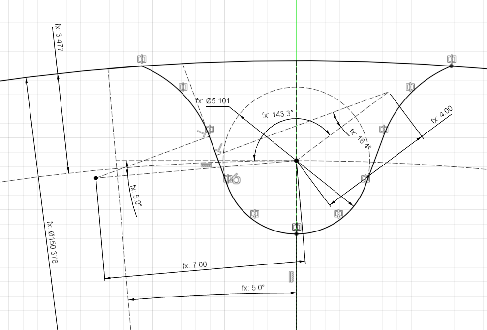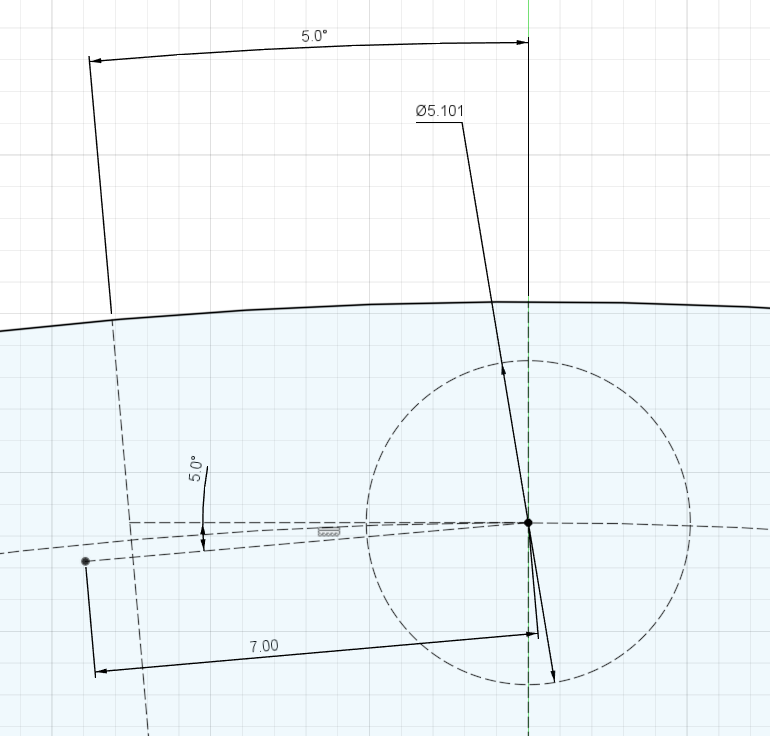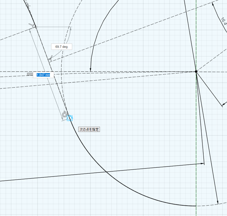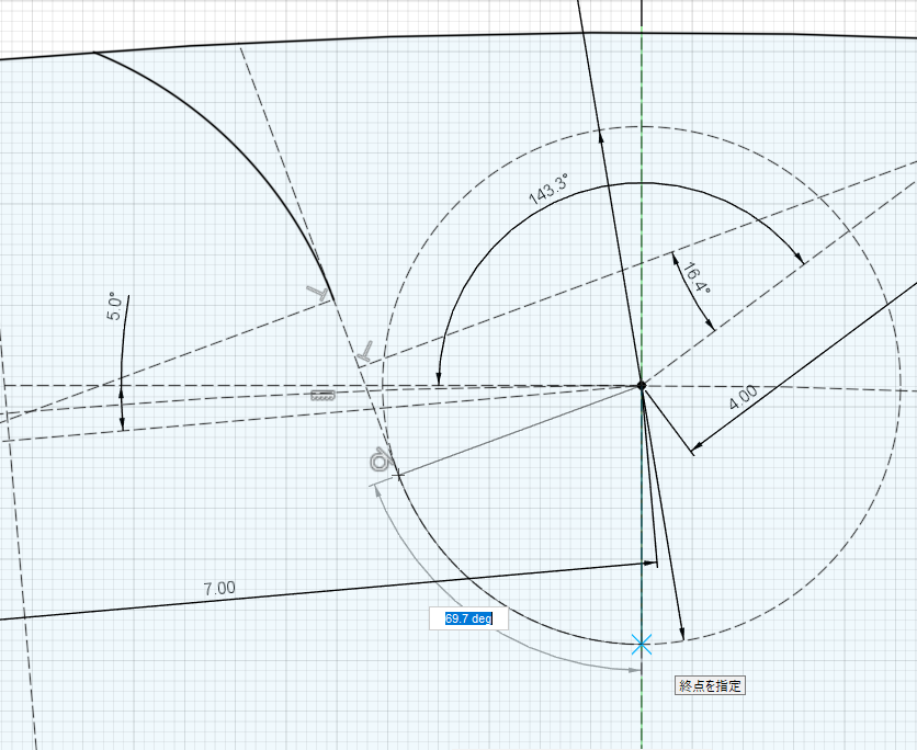 外円に引いた垂線から180 / Z = 5 degのところに半径を引き、先ほど引いた小円の中心から水平線を引く。さらに水平線から180 / Z = 5 deg下げたところに1.4 * Dr = 7mmの線を引く。