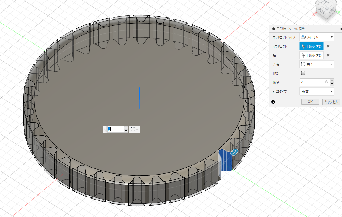 参考元のサイトでは歯を1枚ずつ押し出していたのですが、Fusionでそれをやると一時的に歯数の分だけモデルが生成されて激重なので、円板を切り出していく方式でやります。