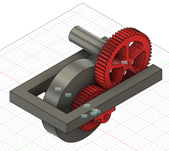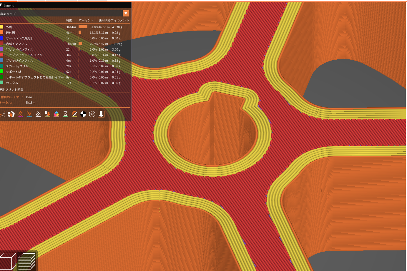先ほども申し上げたとおり、加工などに時間のかかる部品は導入できません。上の3Dモデルで示されている赤い色の独自部品は全て3Dプリントです。しかし当然PLAのテキトーな3Dプリント品が人間の体重やトルクに耐えられるわけがありません。ここではいくつかの工夫を行いました。まず軸受のパーツにおいては荷重が積層の圧縮方向にかかるように配置しました。次に歯車は厚めに設計することで面圧を分散し、さらにインフィルを25%程度に増やし、外壁を6層にしました。外壁を6層にしたことで歯先のインフィルは100%、さらにキー溝にかかるトルクをインフィル100%の壁、しかもフィラメントの連続した方向で受けることが可能になります。