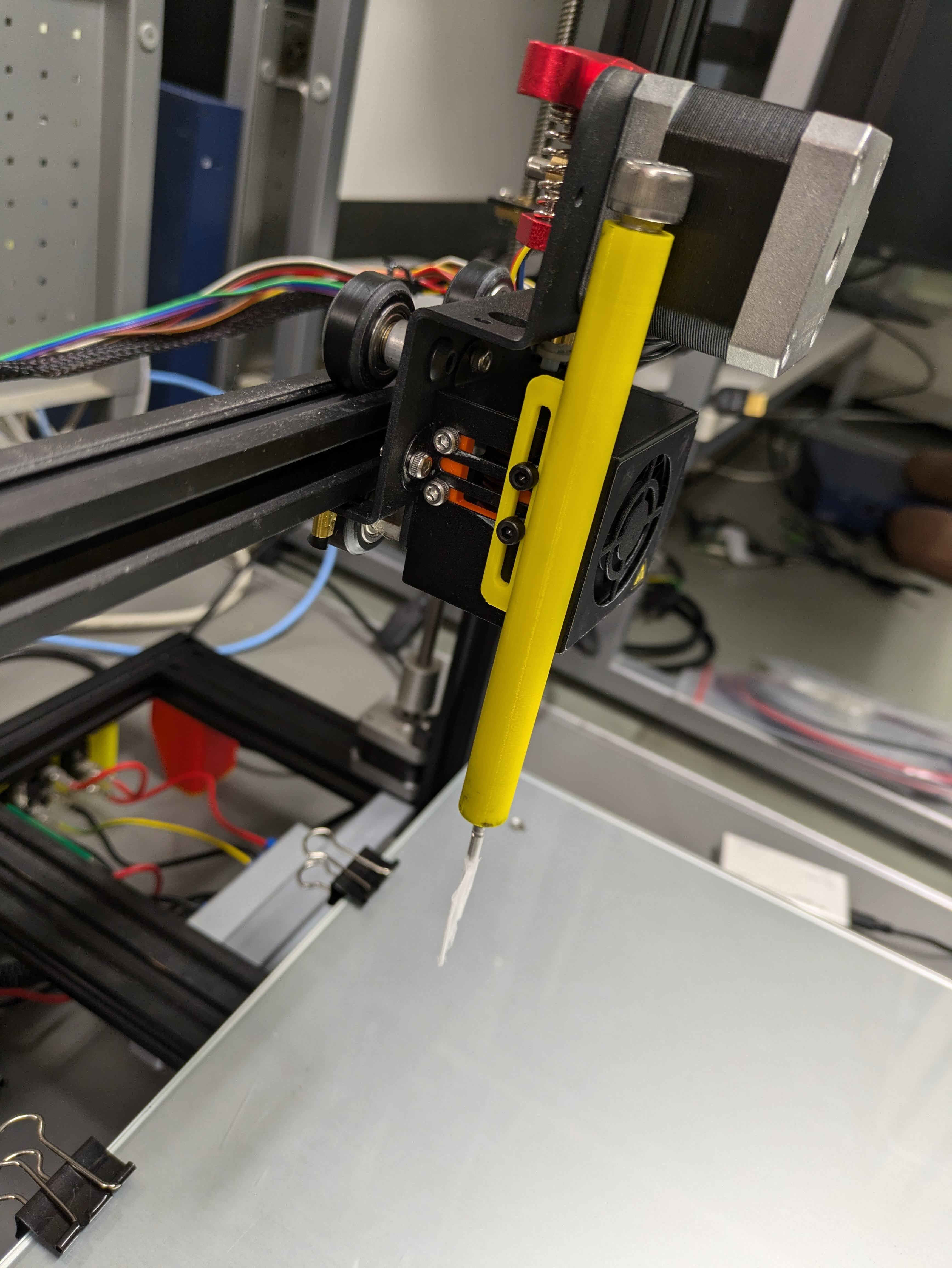ペンが紙にいい感じに当たるように、バネで紙面に押し付けるようなホルダーを作成した。結構無理してもBambuLabがなんとか印刷してくれるので、印刷のしやすさを考慮せず適当にモデリングした。こんな円柱を縦向きに印刷できちゃうのだからすごいことである。冷静に考えたら、円柱部分を三角柱に変えて横置きで印刷し、ネジ部はタップを切るべきだろうと思う。
