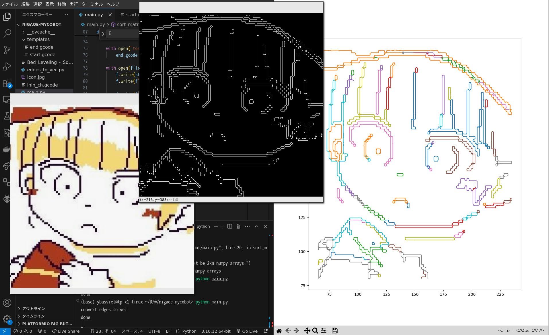 edges = cv2.Canny(gray, 70, 100)検出したエッジのベクトル化は@s-col(スコル) python+OpenCVで検出した画像のエッジを曲線(折れ線)に変換する[Python3] #画像処理 - Qiitaを利用した。上記の実装ではnp.ndarrayのリストのリストが返ってくる実装になっていて、少々使いにくかったため、Nx2のnp.ndarrayのリストが返るように変更した。